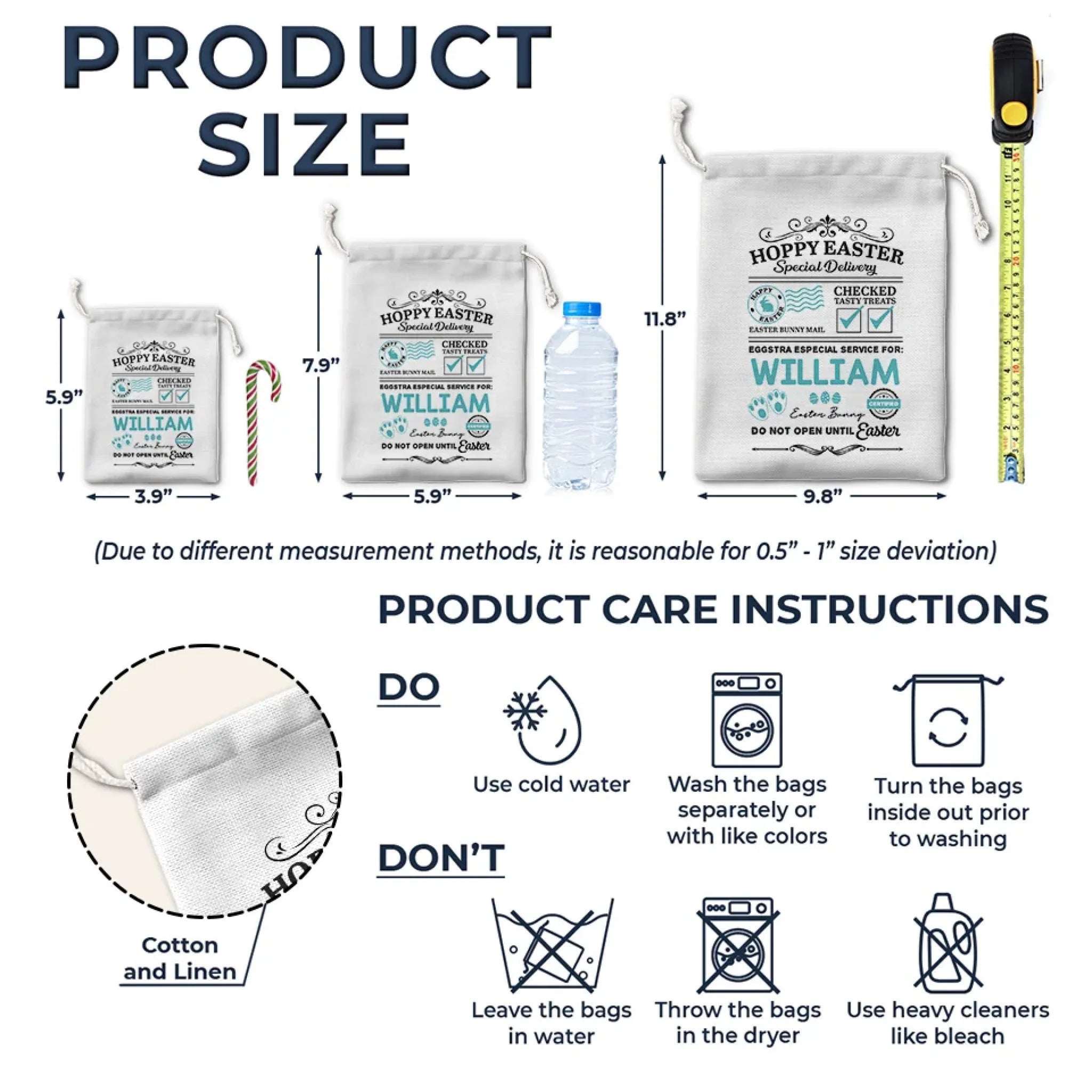 • Care instruction: Use cold water, and turn the bags inside out before washing. Don't use heavy cleaners like bleach.