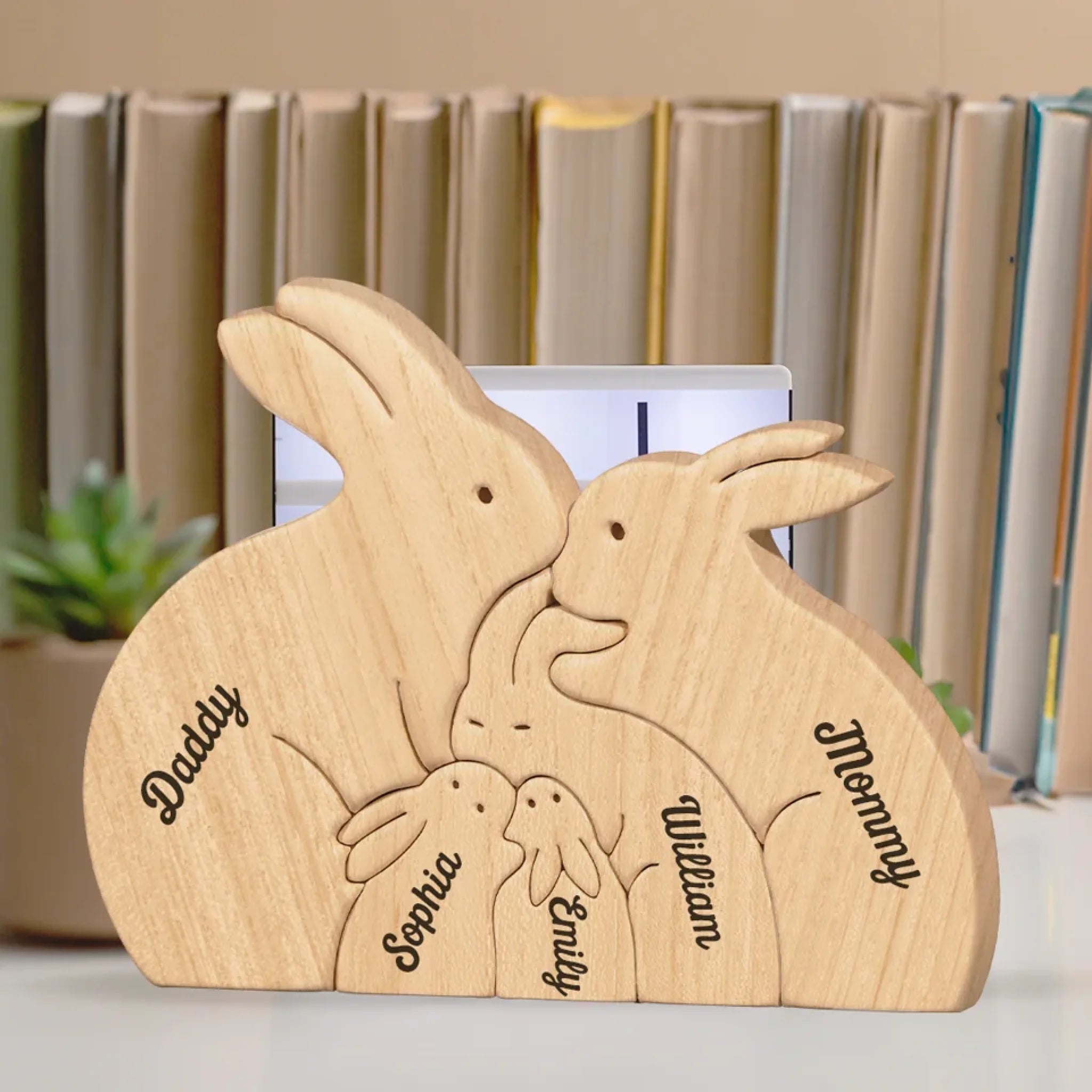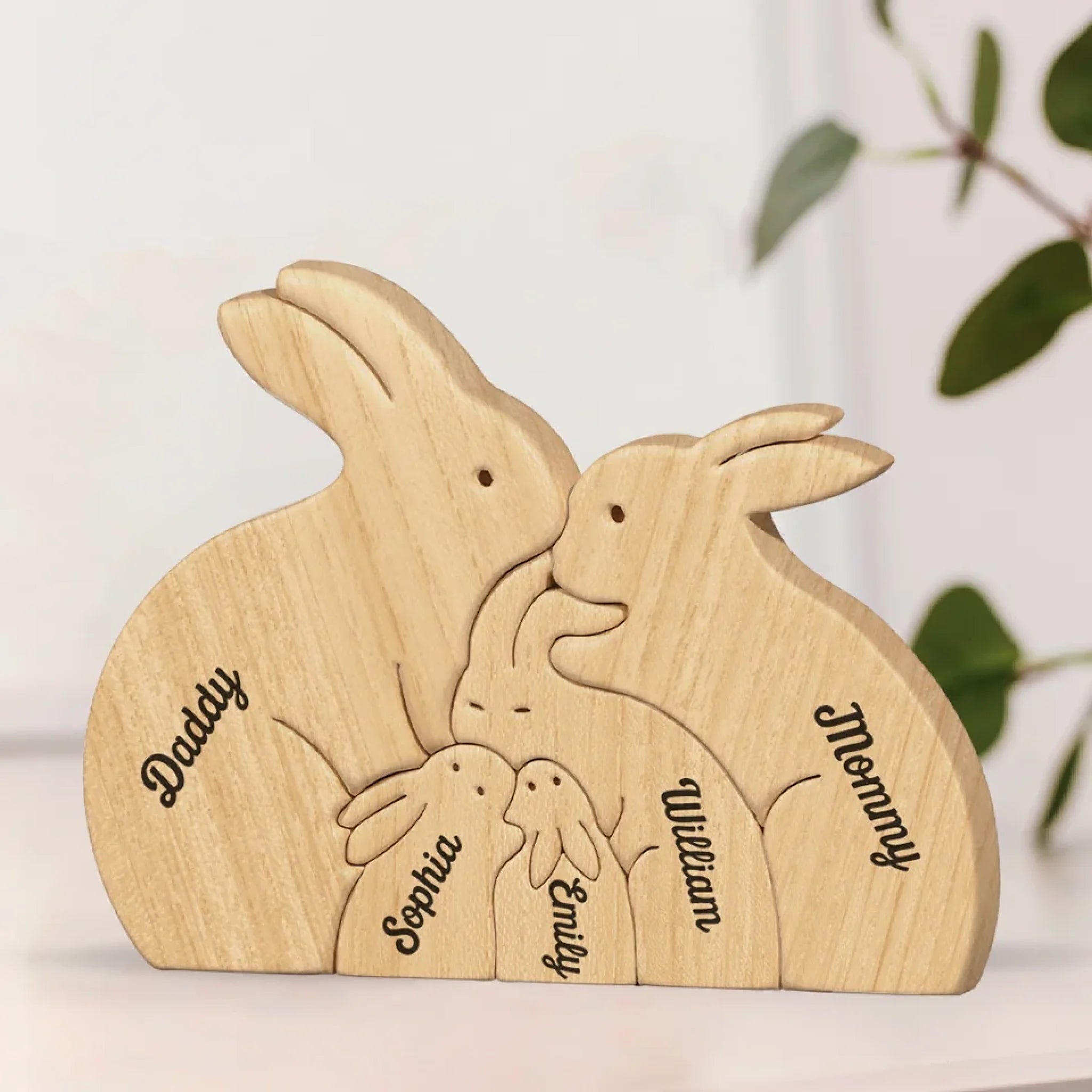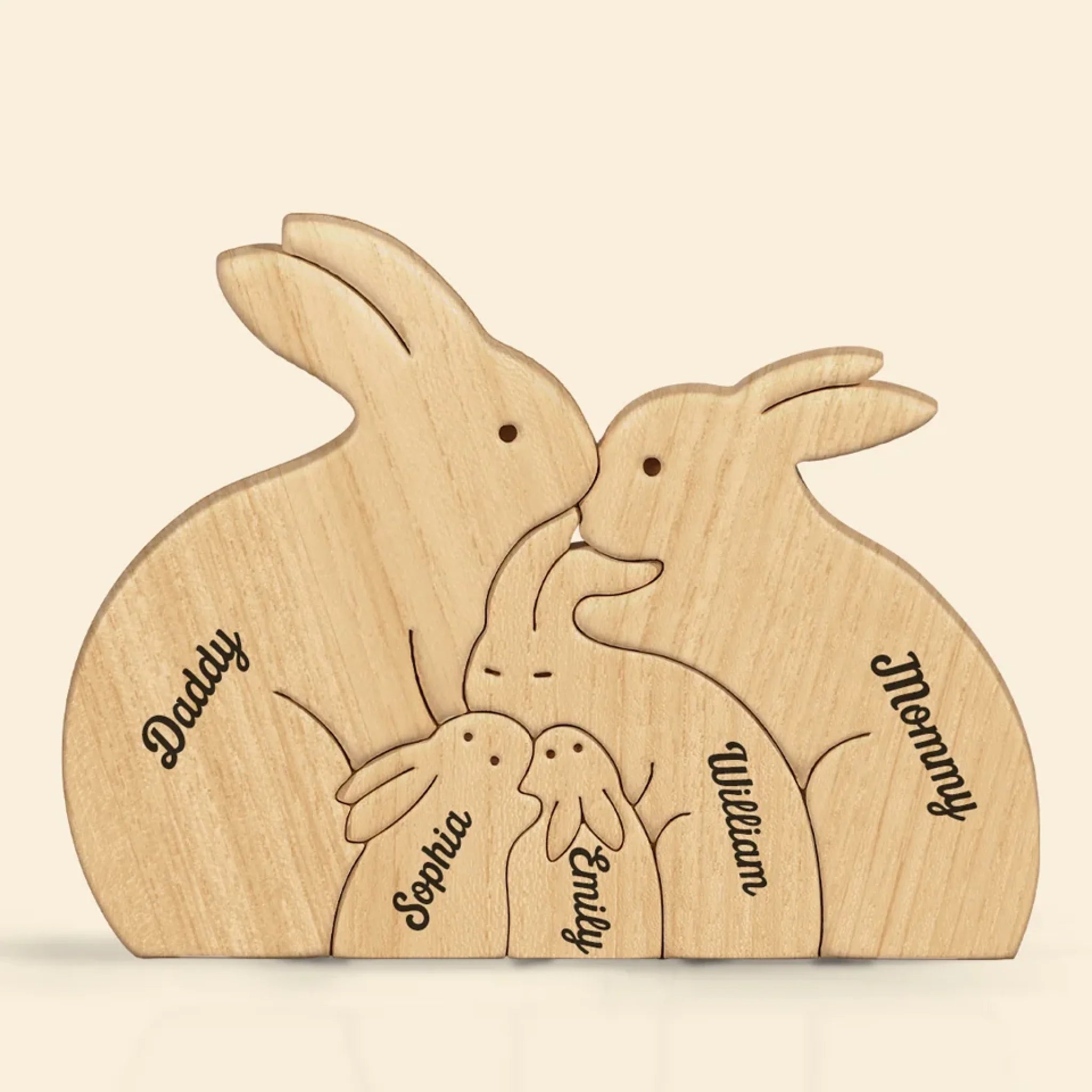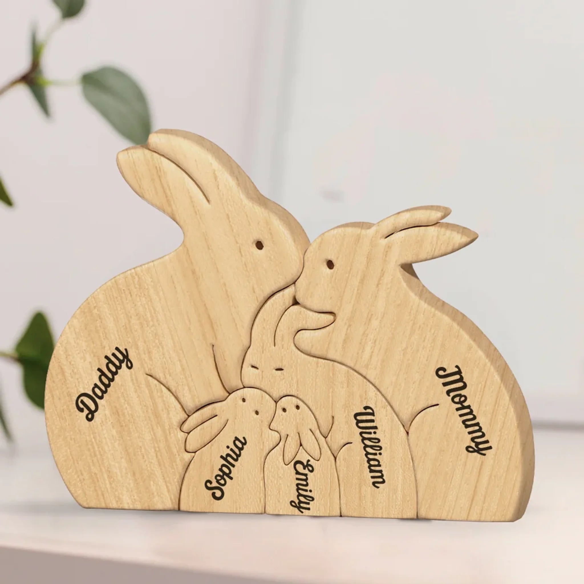 Family Love In A Bunny Hug - Family Personalized Custom Rabbit Shaped Wooden Art Puzzle - Wooden Pet Carvings, Wood Sculpture Table Ornaments, Carved Wood Decor - Gift For Family Members