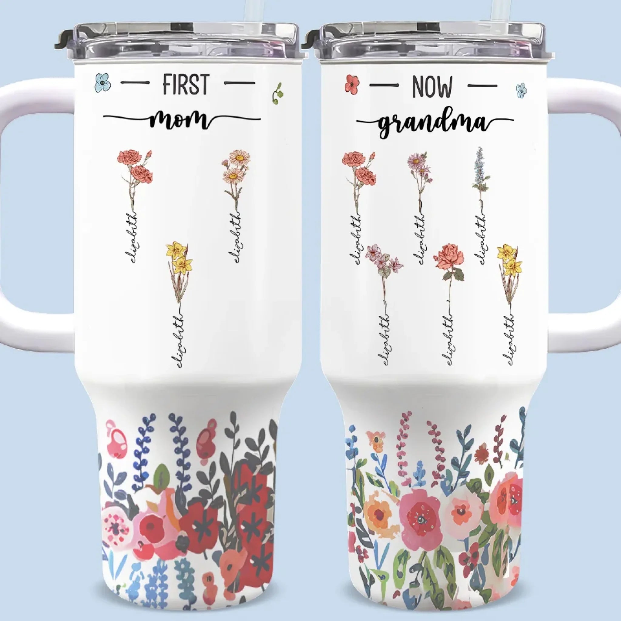 Three Generations, Blooming Together - Family Personalized Custom 40 Oz Stainless Steel Tumbler With Handle - Gift For Mom, Grandma